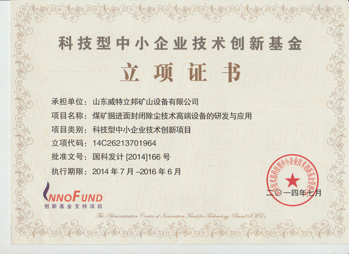 • 科技型中小企業技術創新基金立項證書